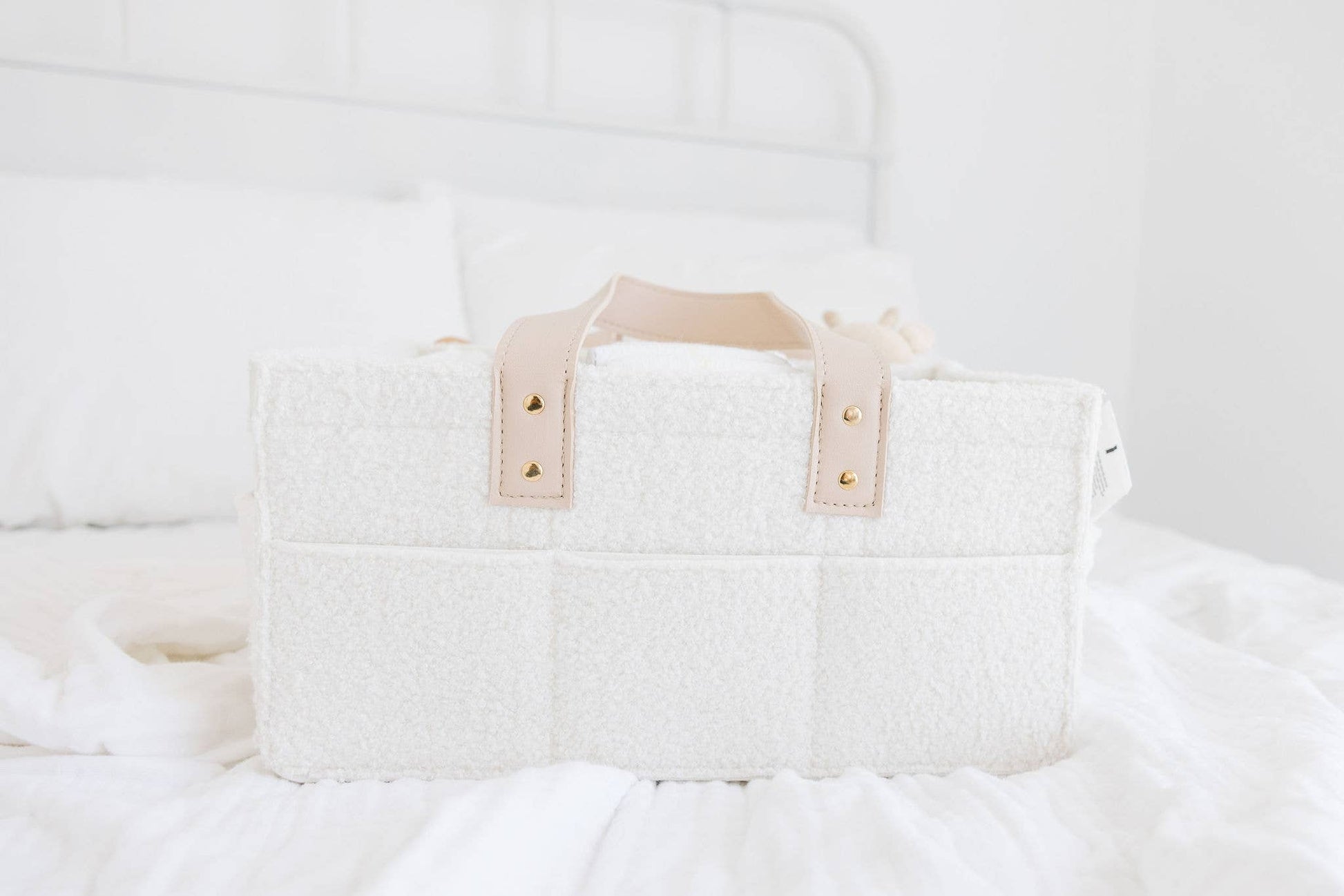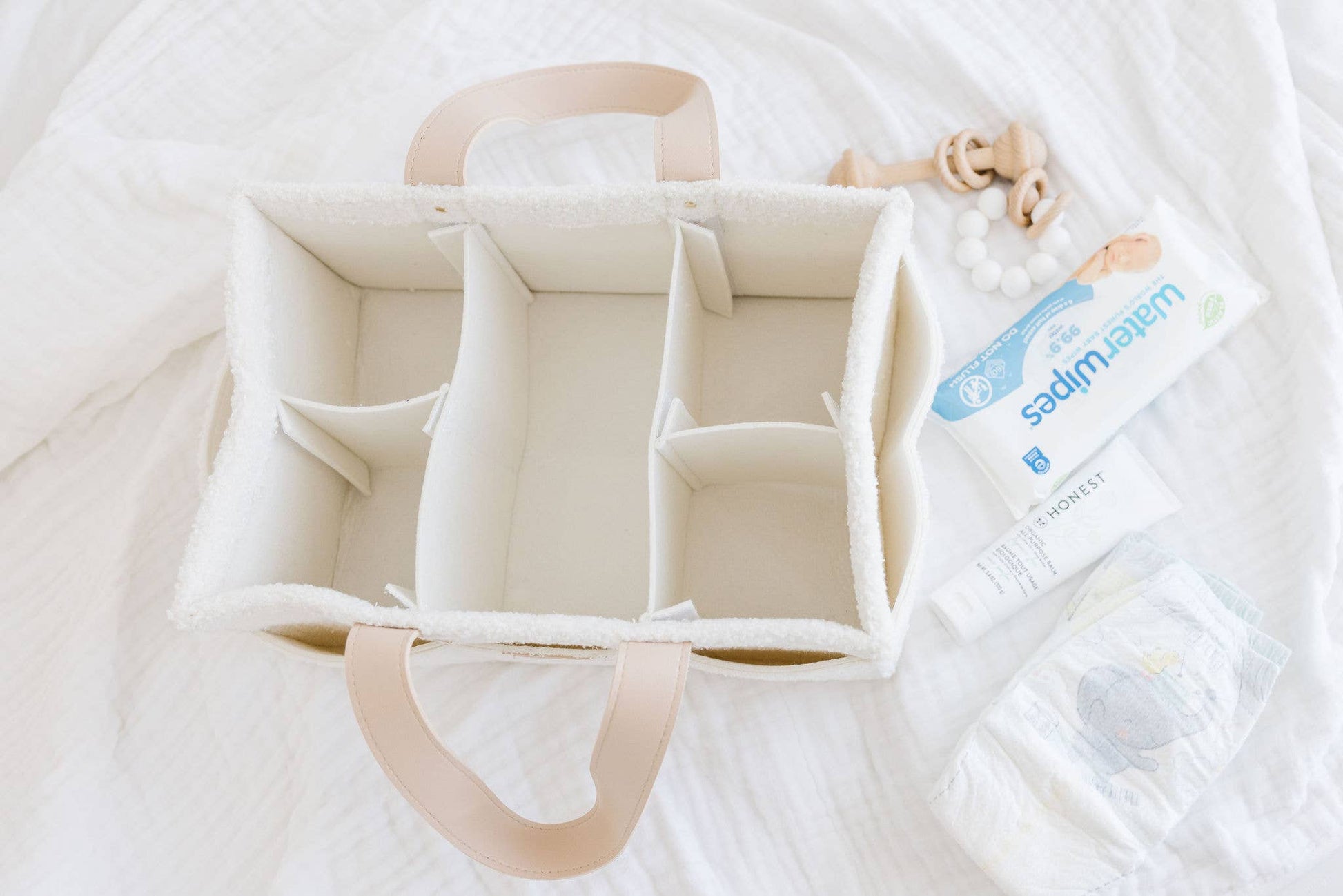 Our diaper caddy is a must have new parent item! With room to hold all of baby's essentials it's perfect to use as a changing table organizer, pumping station, or to hold diaper changing supplies in the car. The removable dividers and generous size make it easy to accommodate everything you need from diapers, wipes, creams, burp cloths, and toys to pumping supplies + bottles. The neutral cream teddy fabric and faux leather handles compliment any nursery design.