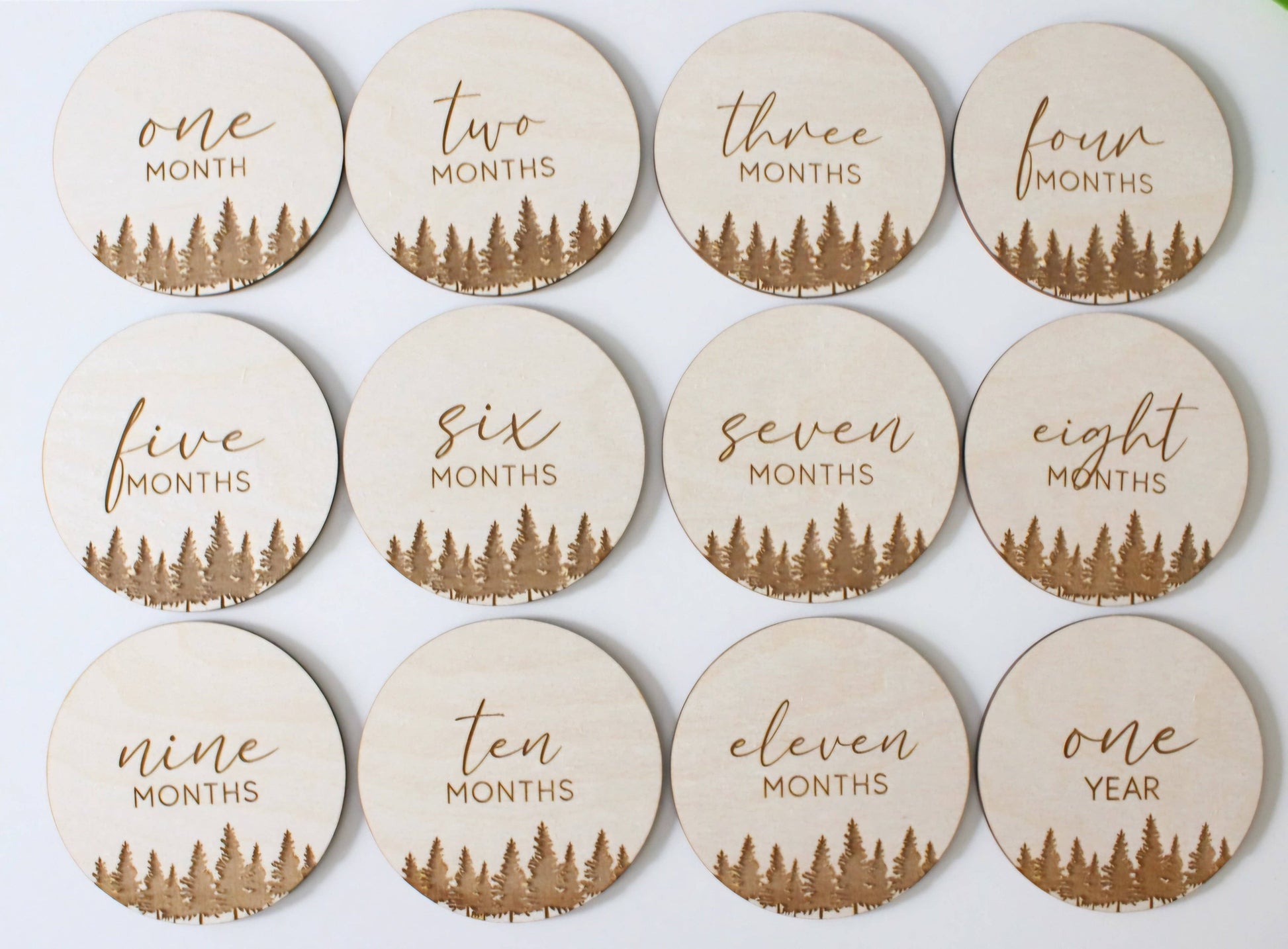 Mark your baby's first year with these wooden milestone tiles, perfect for monthly photos you'll cherish forever. Crafted from 1/8” maple-finished plywood, each tile features precise laser cutting and engraving. Measuring about 4 inches, they combine durability with a refined look.